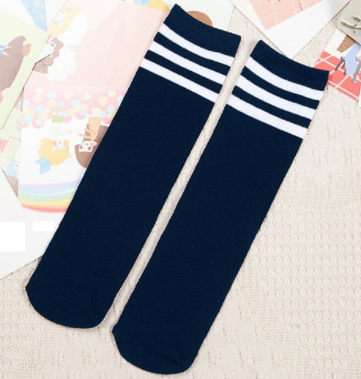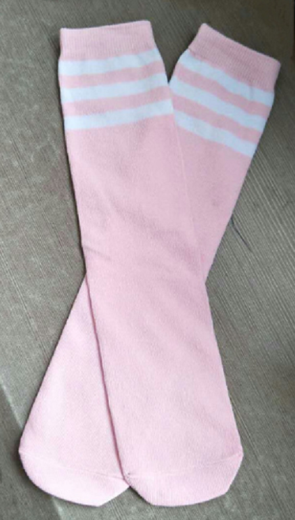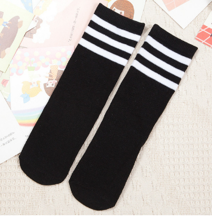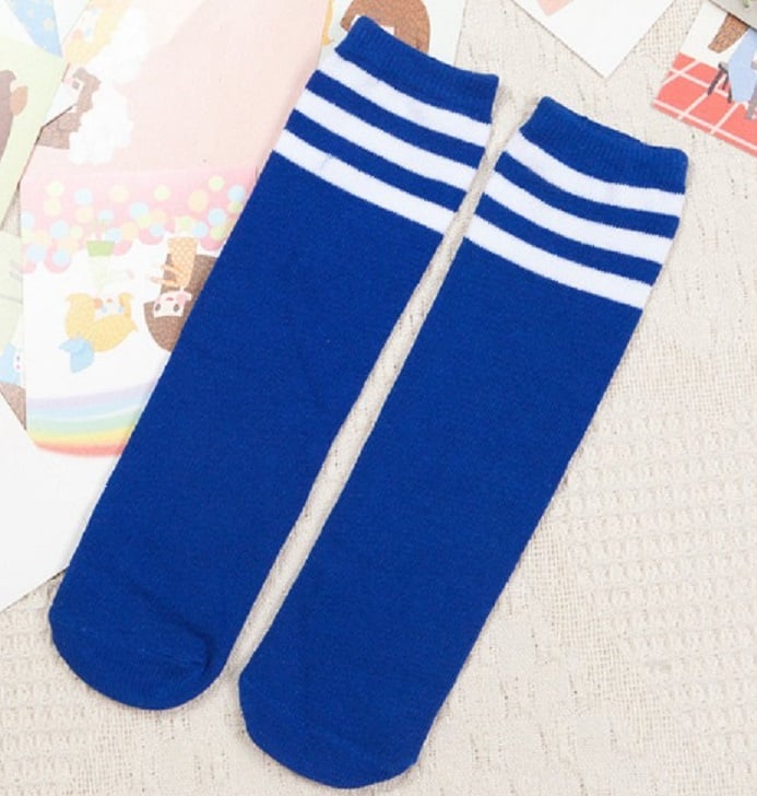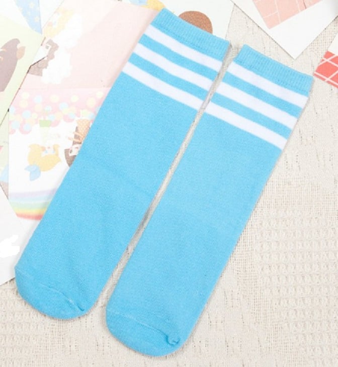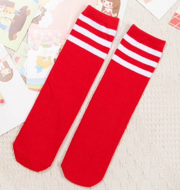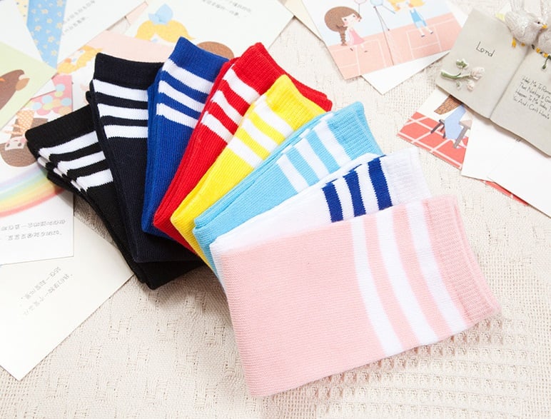 The socks are colourful and have 3 white stripes around the top.