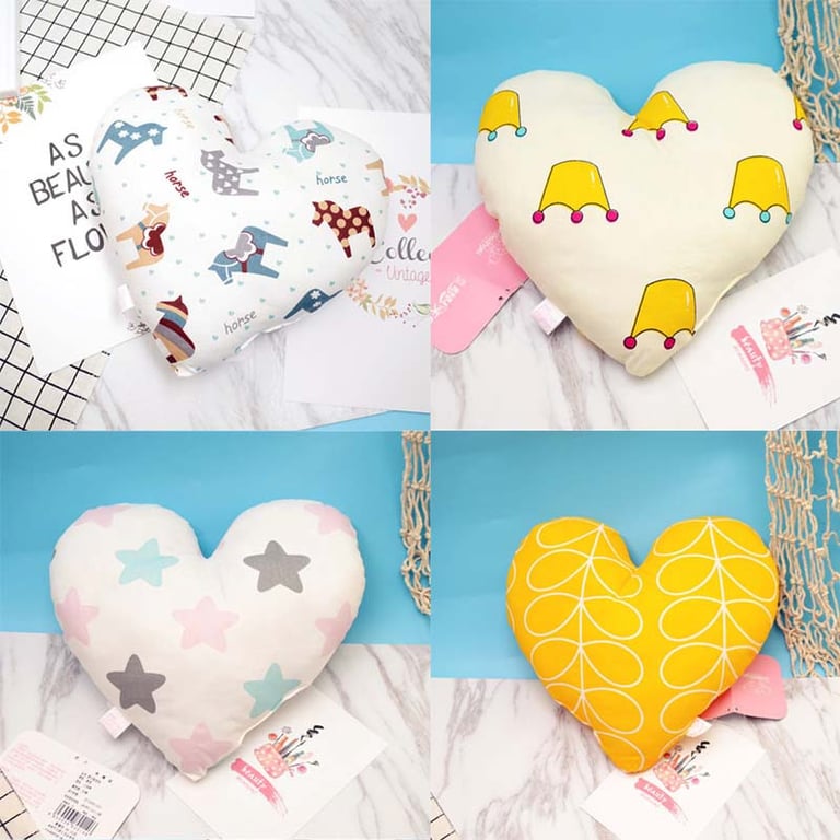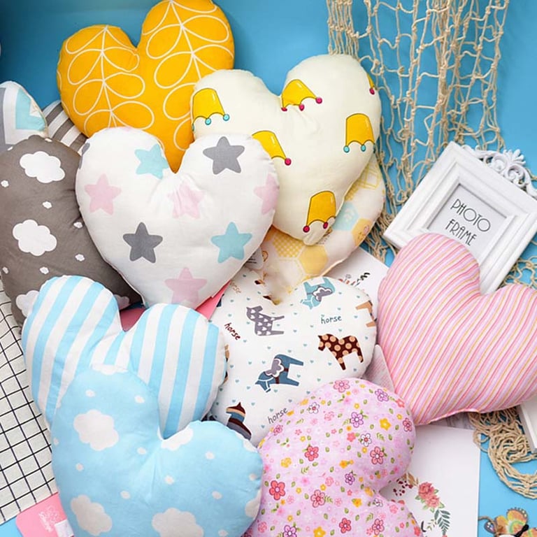Heart-shaped cushions for children, featuring various motifs and patterns.