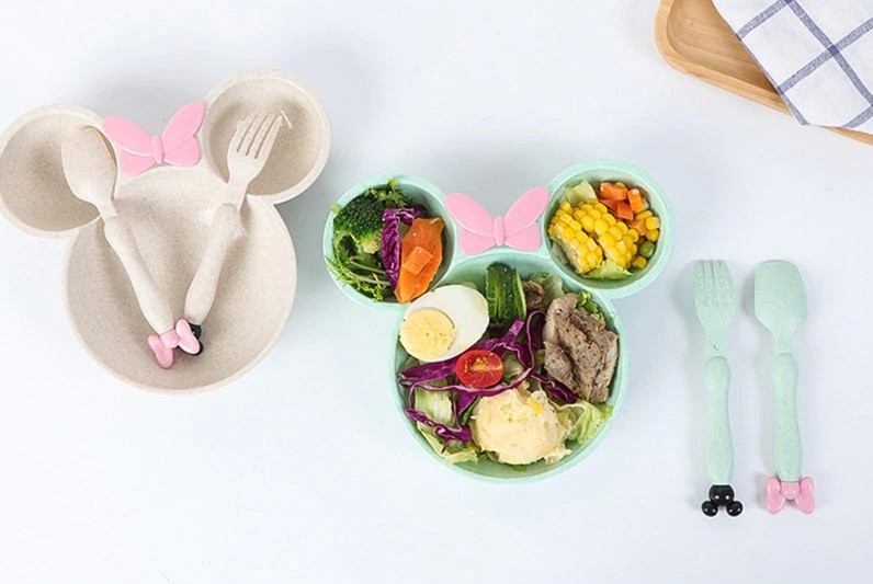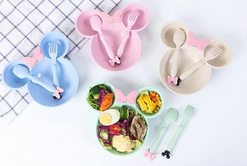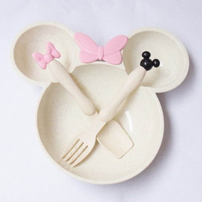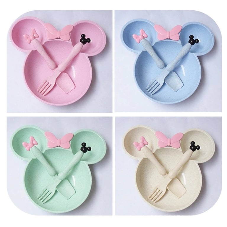 This set includes a bowl in the shape of Mickey's head, a fork, and a spoon.