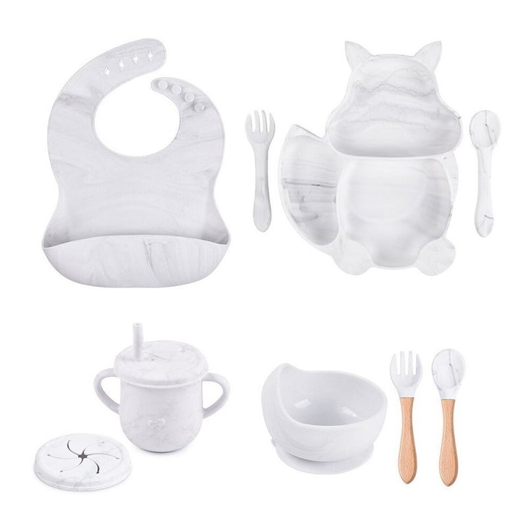 : 1x bowl, 1x plate, 1x mug, 1x bib, 2x forks, 2x spoons