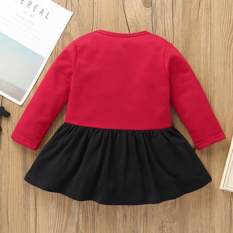 Children's dress with long sleeves and a gathered skirt. Patch with a reindeer motif on the front. Two colour variants.