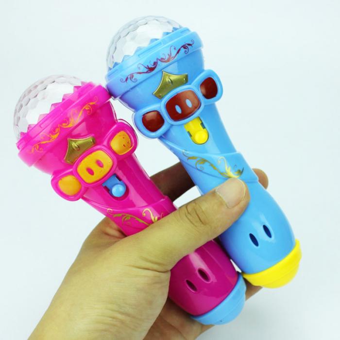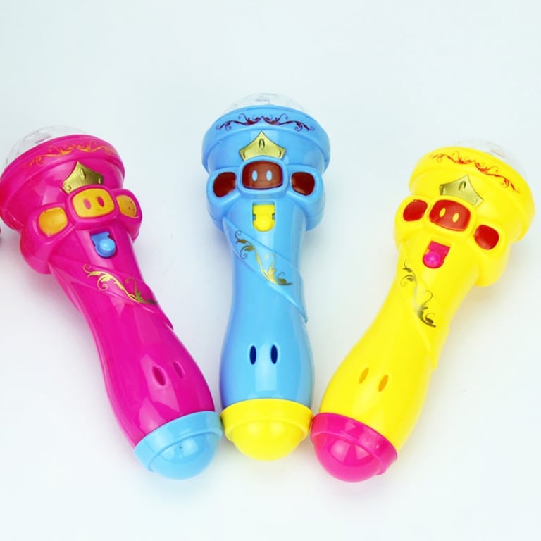 Creative children's microphone. Available in blue, yellow, and pink. The microphone produces sounds and also projects decorative dots on the wall, allowing your children to create their own disco at home.