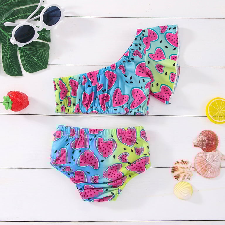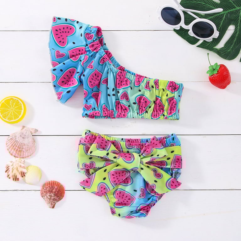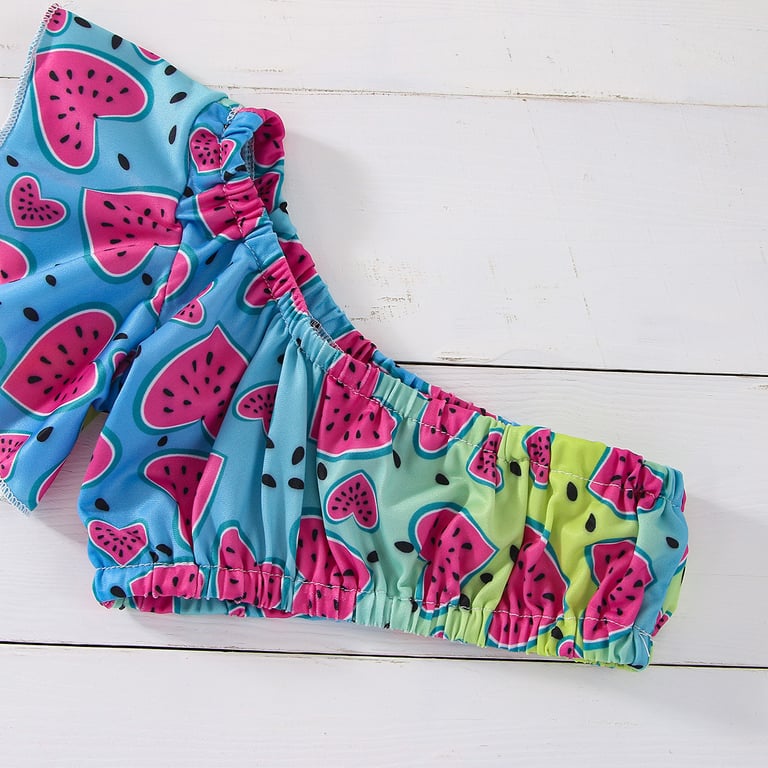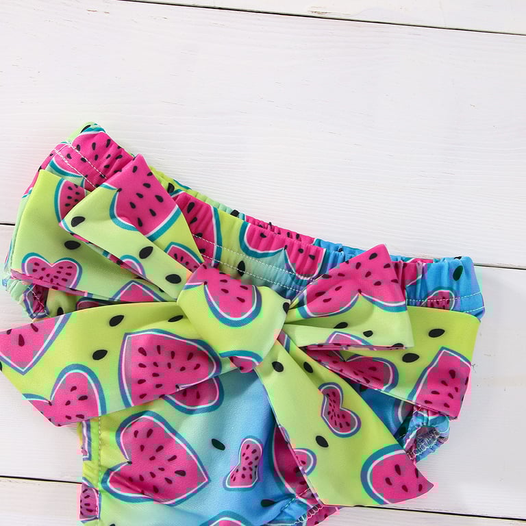 • Beautiful children's girls' two-piece swimsuit, unique due to its print featuring a colourful design along with watermelons and a bow across the entire bottom piece.