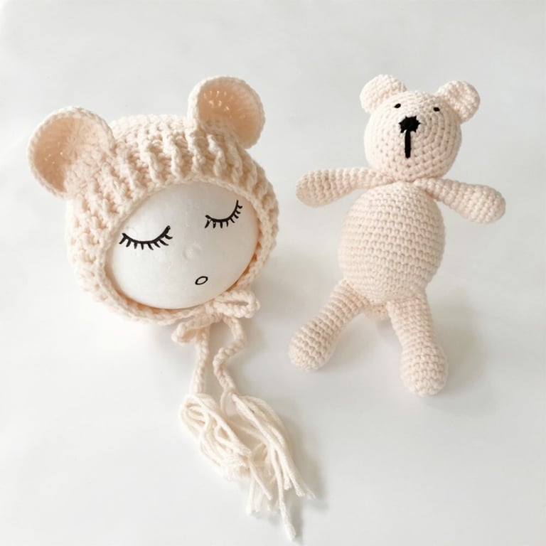Beautiful knitted set for the smallest children - a hat with ears and a teddy bear in the same colour.