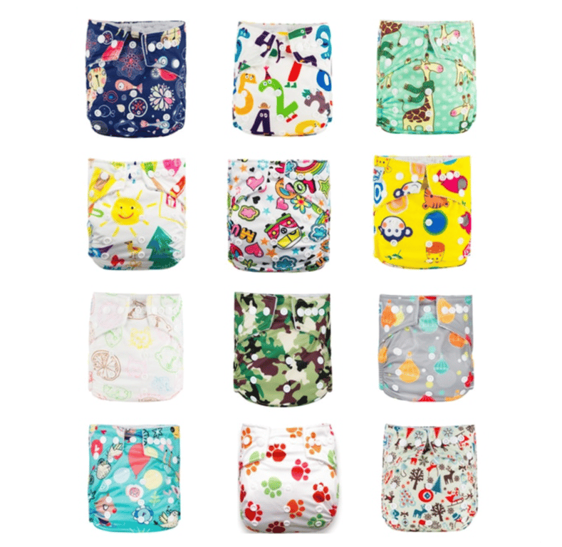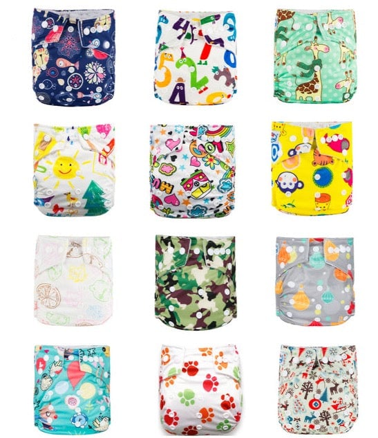 Washable nappies for boys and girls, 12 pieces in various designs.