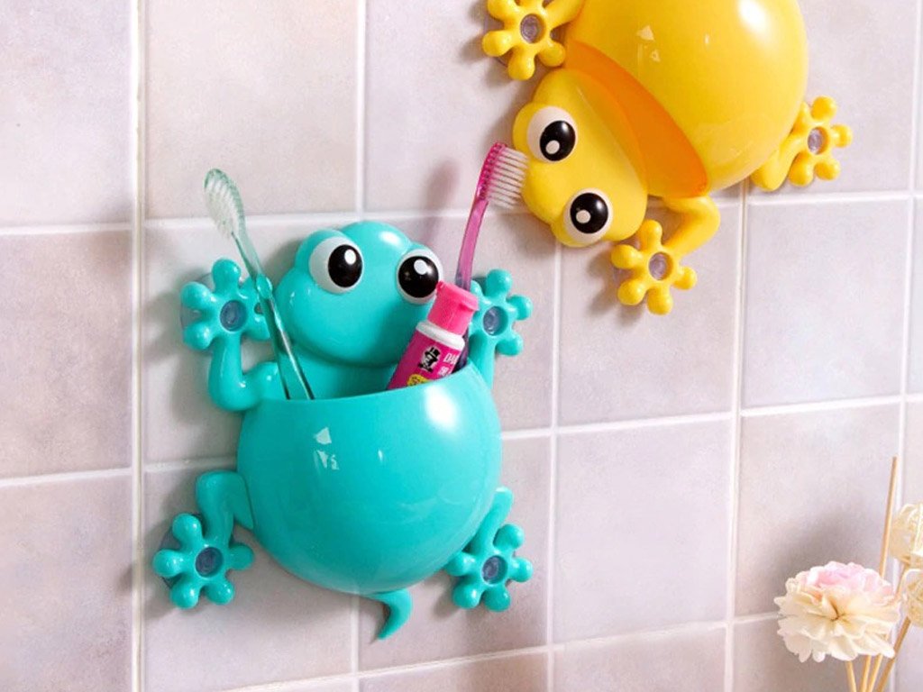 Beautiful bathroom organiser Frog designed for your children's toothbrushes and toothpaste. It can be easily attached in the bathroom using 4 suction cups. Choose from 4 colours.
