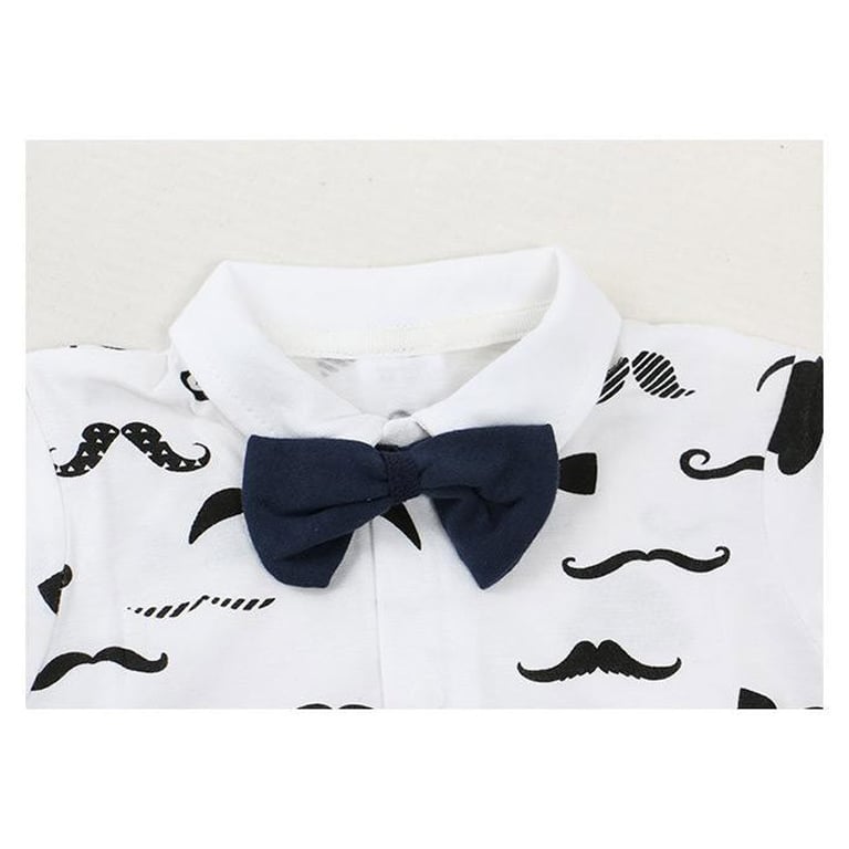 Children's original short-sleeved overall. Button fastening. White with a pattern of black moustaches and a bow tie.