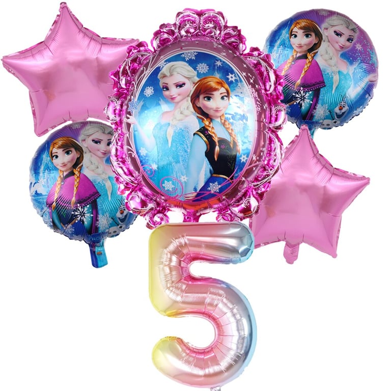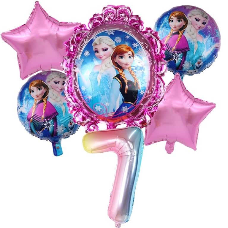 The set includes 1 piece of number, 1 large balloon with Elsa, 2 star-shaped balloons, and 2 smaller balloons.