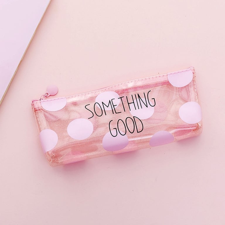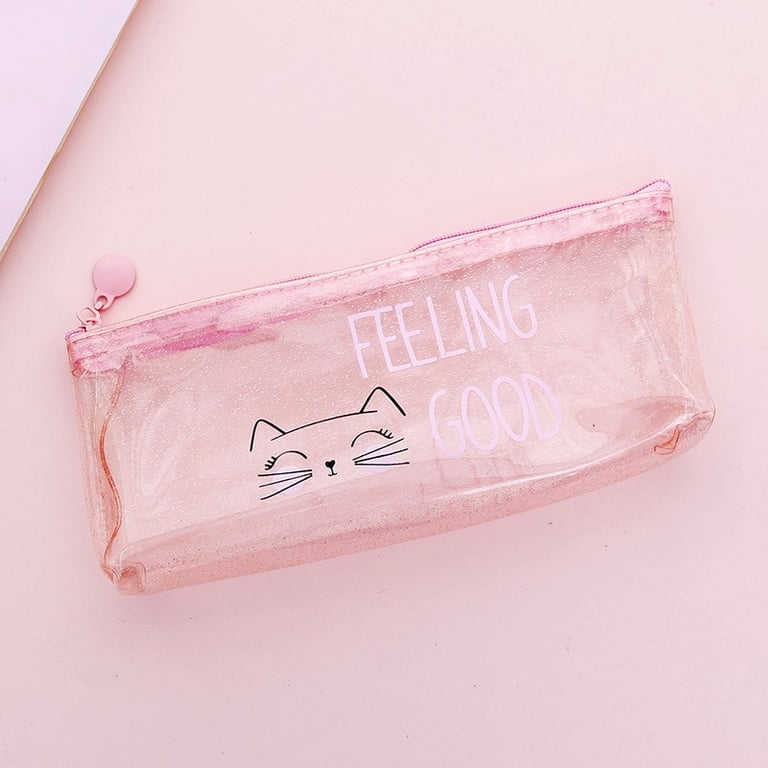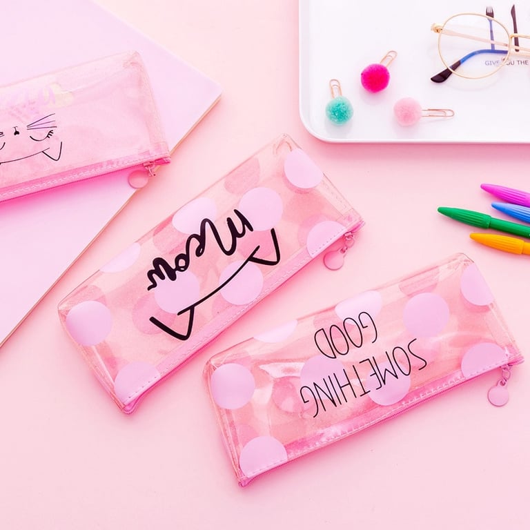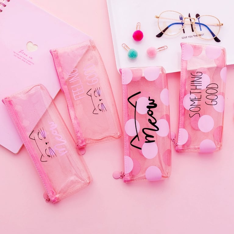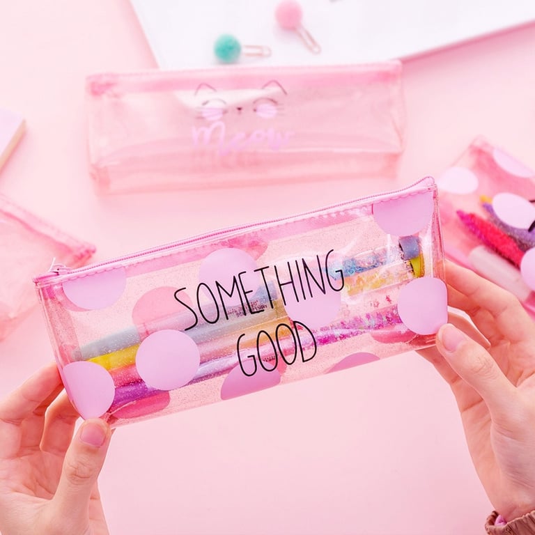 Transparent pencil case with a charming inscription and design.