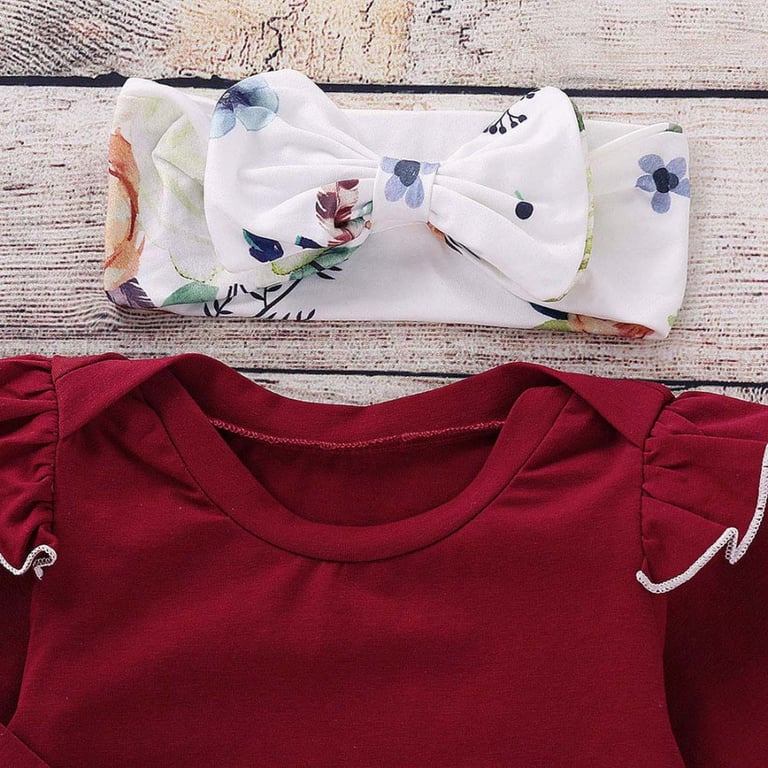 Clothing set for little girls. The set includes trousers with a floral pattern, a long-sleeved top with a ruffle, a headband, and a hat with a floral pattern.