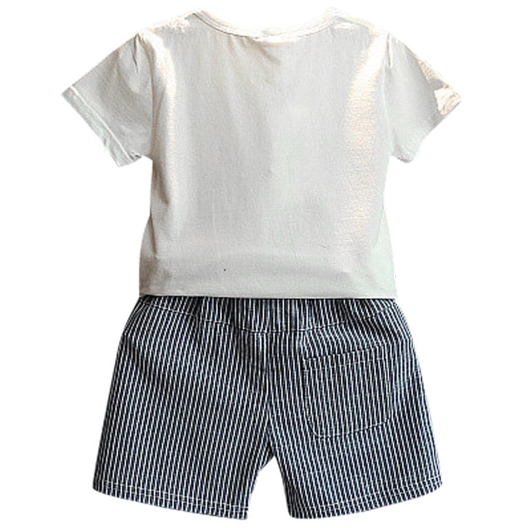 A beautiful children's set featuring a dinosaur t-shirt and striped shorts will delight any child.