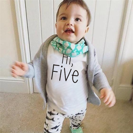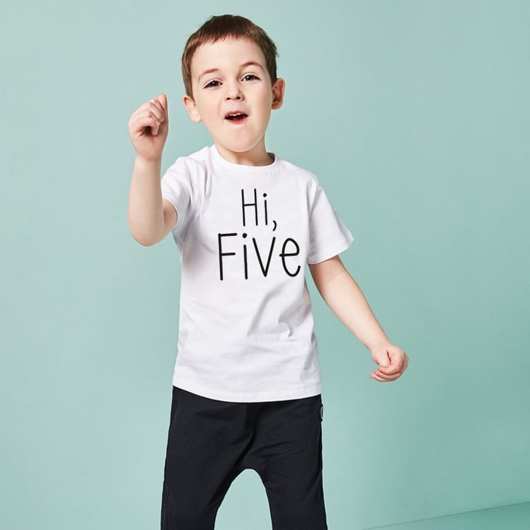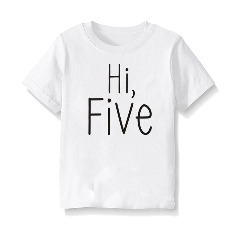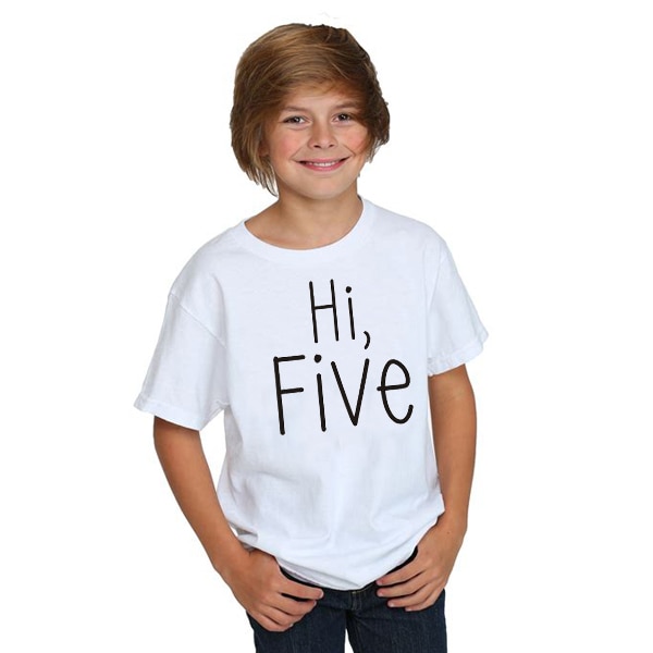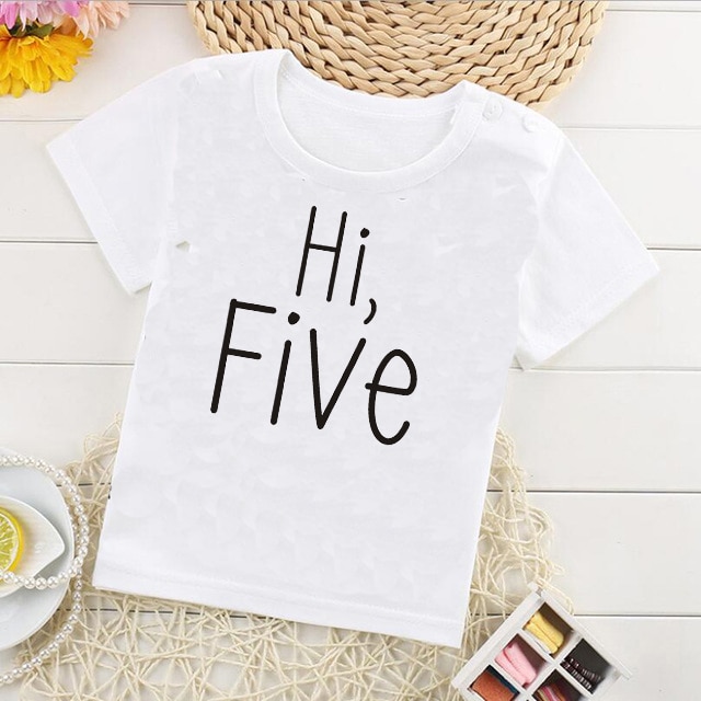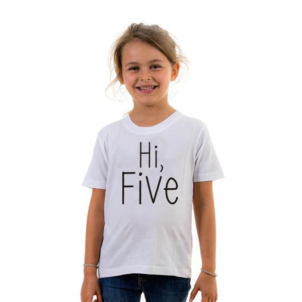 Absolutely simple white t-shirt with the inscription Hi, five.