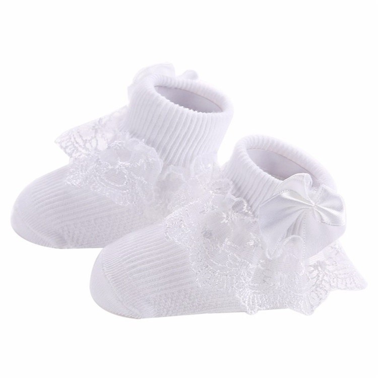 They are adorned with lace ruffles and a bow.