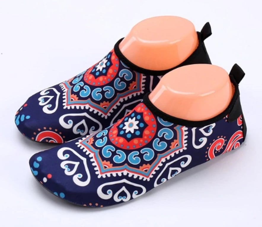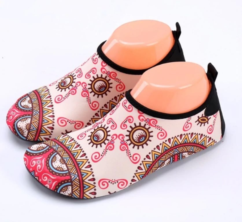 The shoes have a rubber sole that protects them from pebbles and sand.
