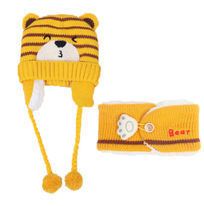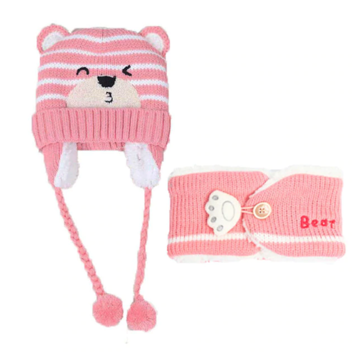 Children's winter hat and neck warmer with a teddy bear