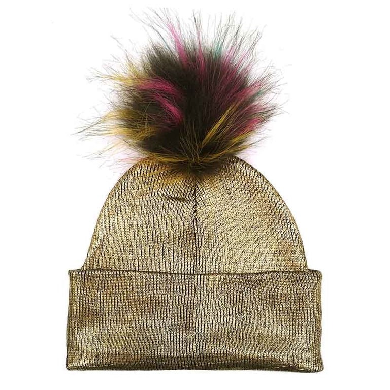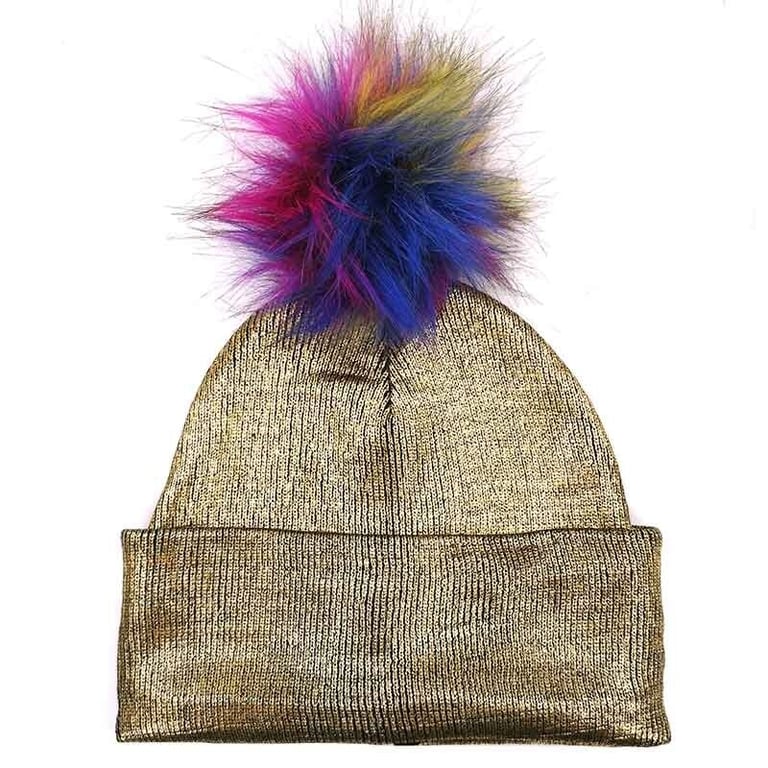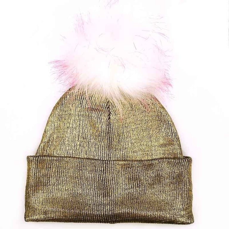 Children's hat in metallic gold colour with a fluffy pom-pom.