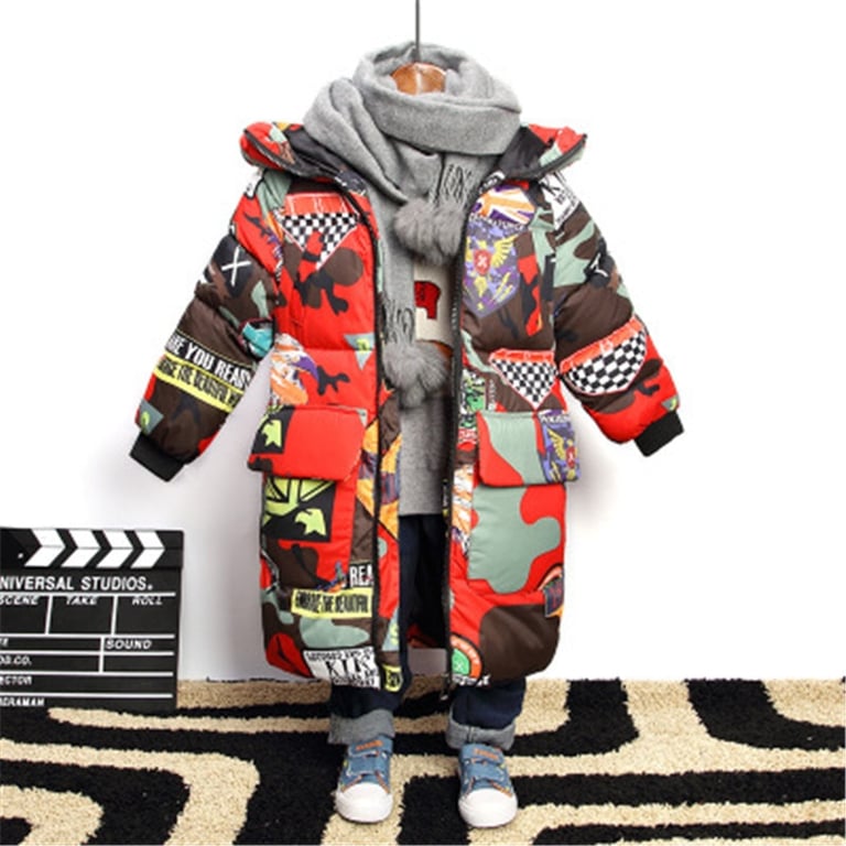 A warm winter jacket featuring a comic design to keep every little child warm.