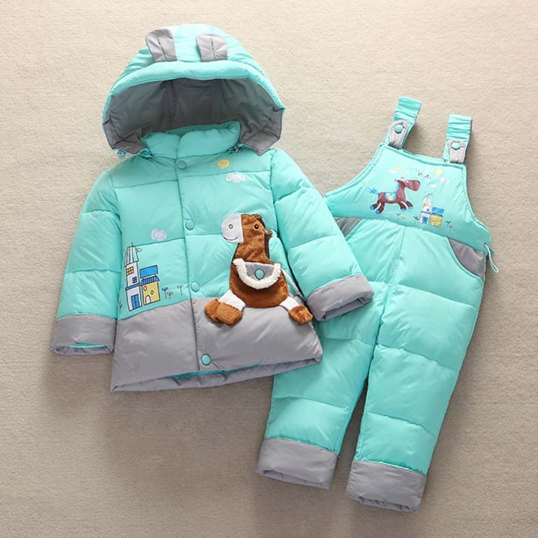 The children's winter suit consists of trousers and a jacket. There are colours available for both boys and girls.