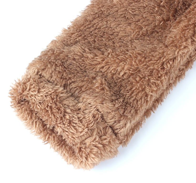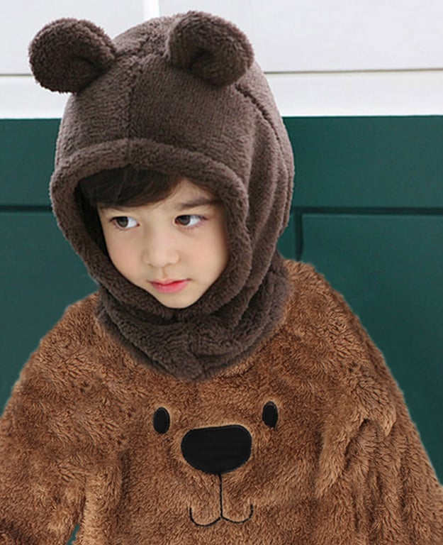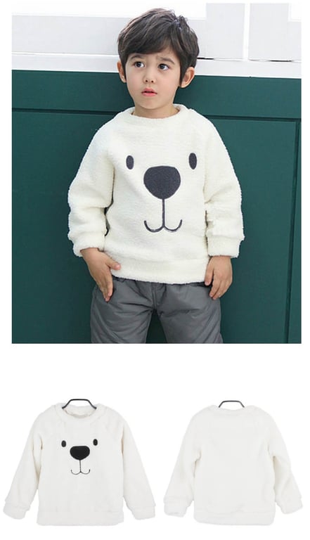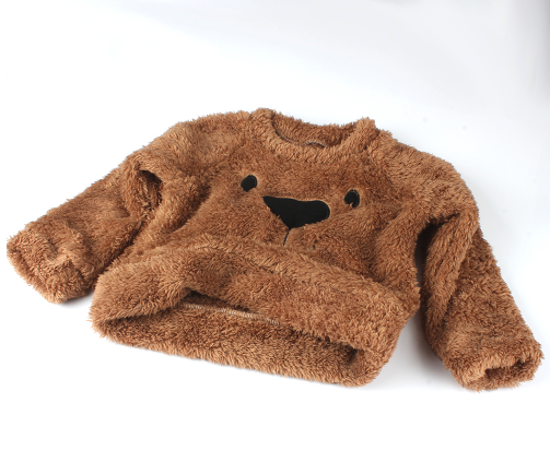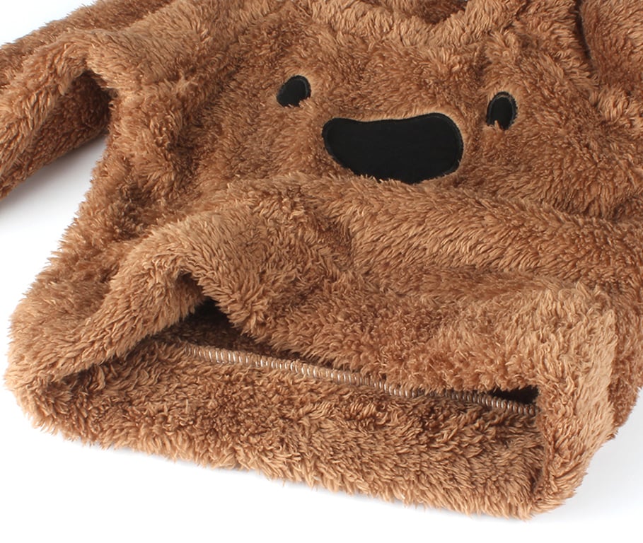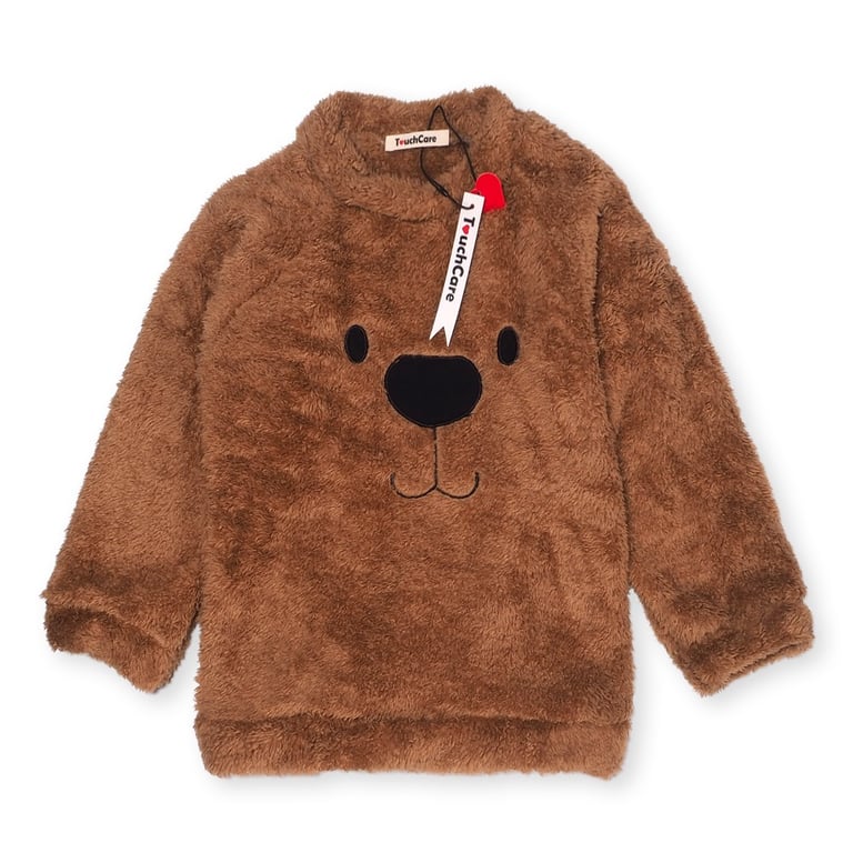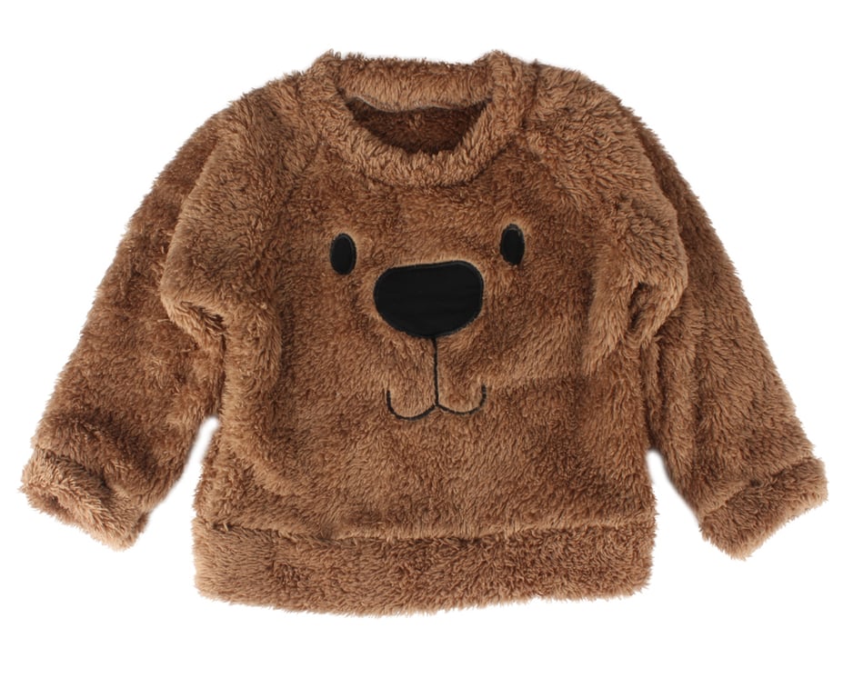 The sweater features a bear's snout on the front.