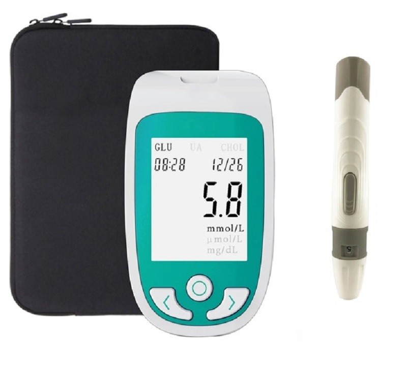 The professional 3-in-1 cholesterol meter is a device for measuring cholesterol, blood glucose, and uric acid. Quick examination in just 20 - 60 seconds. High accuracy of results. Simple operation for everyone. It has an internal memory with up to 300 measurement records. The package also includes a lancing device, lancets, and test strips. Suitable for home use and professional use.