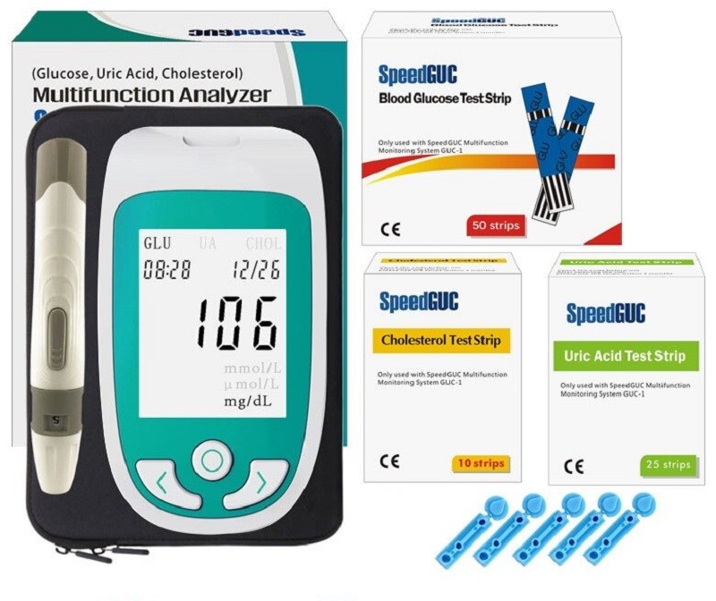 Package contents: 1x cholesterol meter, 1x lancing device, 85x lancets, test strips (50x for glucose, 25x for uric acid, 10x for cholesterol)