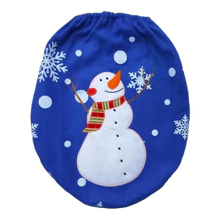 Bathroom set with a Christmas motif: mat, toilet seat cover, and toilet tank cover.