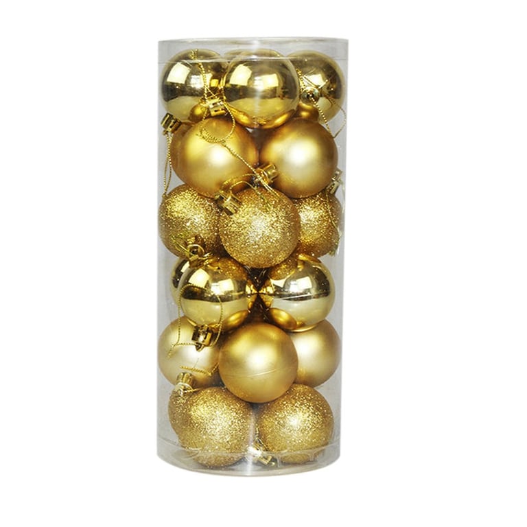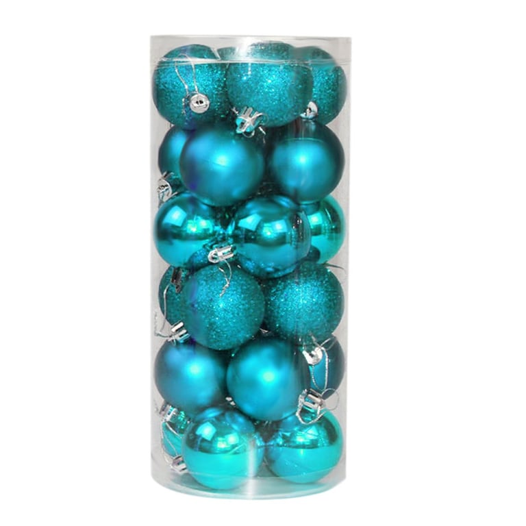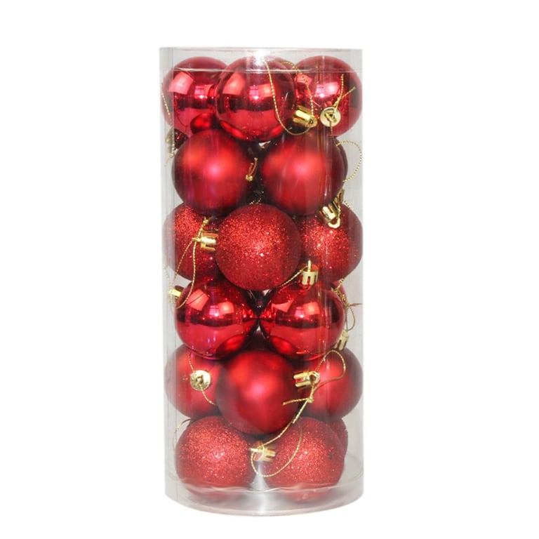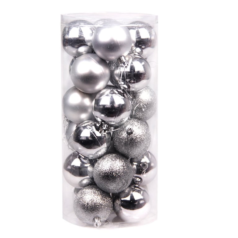 Twenty-four Christmas baubles for hanging on the tree. Choose from various colour variations. The baubles are plastic with a diameter of 3 cm.