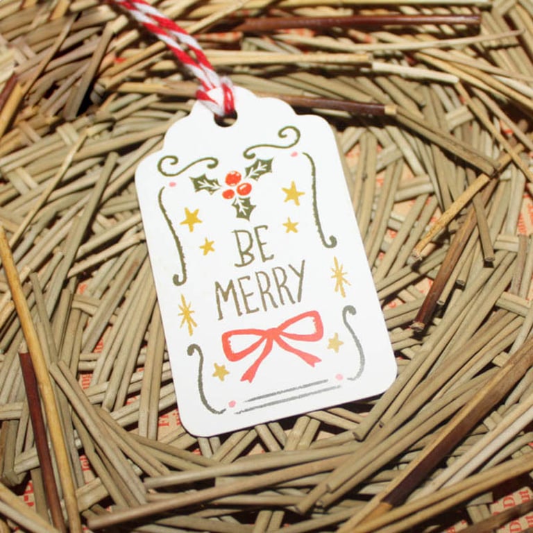 A set of paper Christmas gift tags.