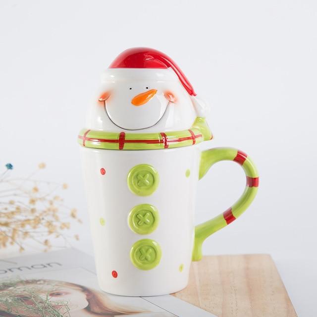 Ceramic mug in Christmas colours with a lid shaped like a snowman's head. Ideal as a gift.