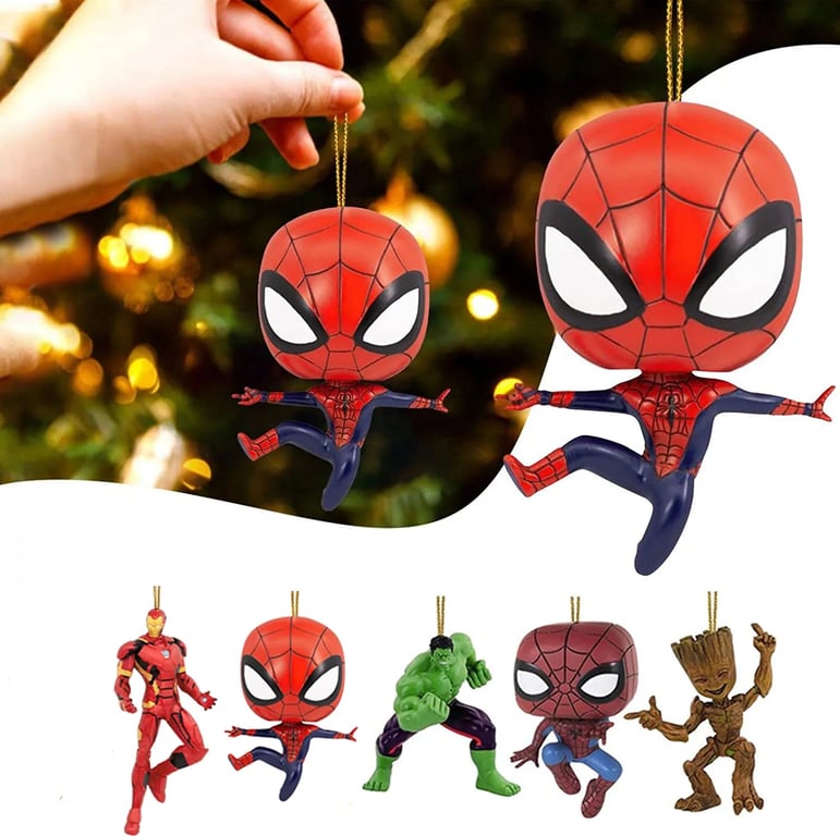 Christmas tree decoration featuring Spiderman, Hulk, Black Panther, Iron Man, and Groot.