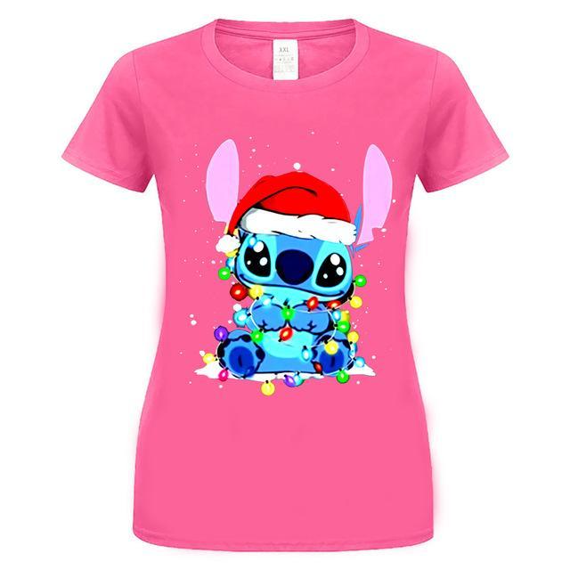 Funny women's cotton t-shirt with a Stitch print in the form of Santa. Ideal as a Christmas gift.