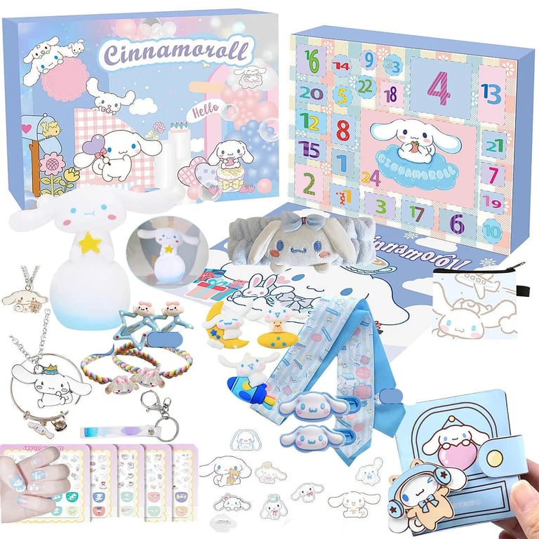 The Advent calendar featuring the Cinnamoroll motif will delight all fans of this adorable Japanese character. In the calendar you will find 24 different surprises – figurines, keychains, bracelets, hair ties, temporary tattoos, stickers, blocks, a mini pouch, or a small lamp, all in a soft pastel style with Cinnamoroll-themed designs. Each day of Advent awaits a new charming accessory or creative gift for fun, decorating and crafting.