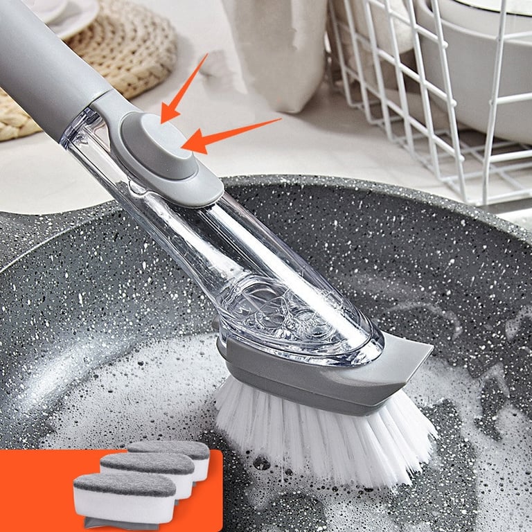 Cleaning brush with a detergent dispenser and interchangeable head.