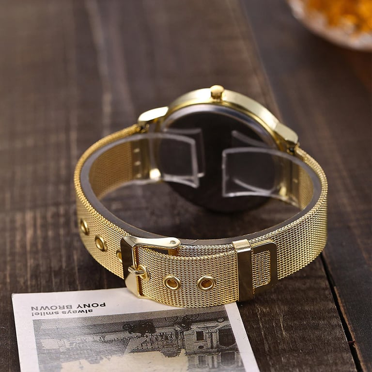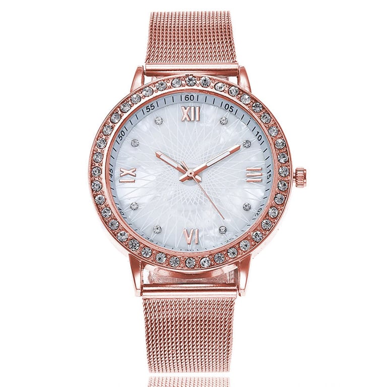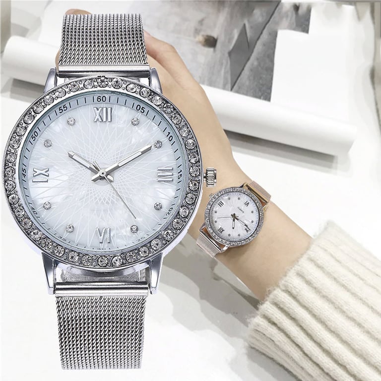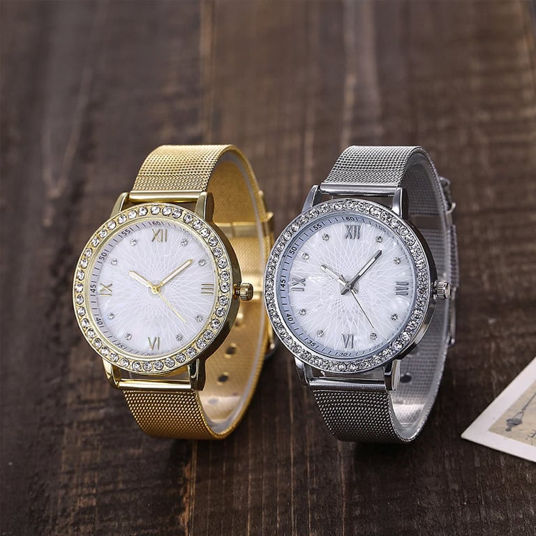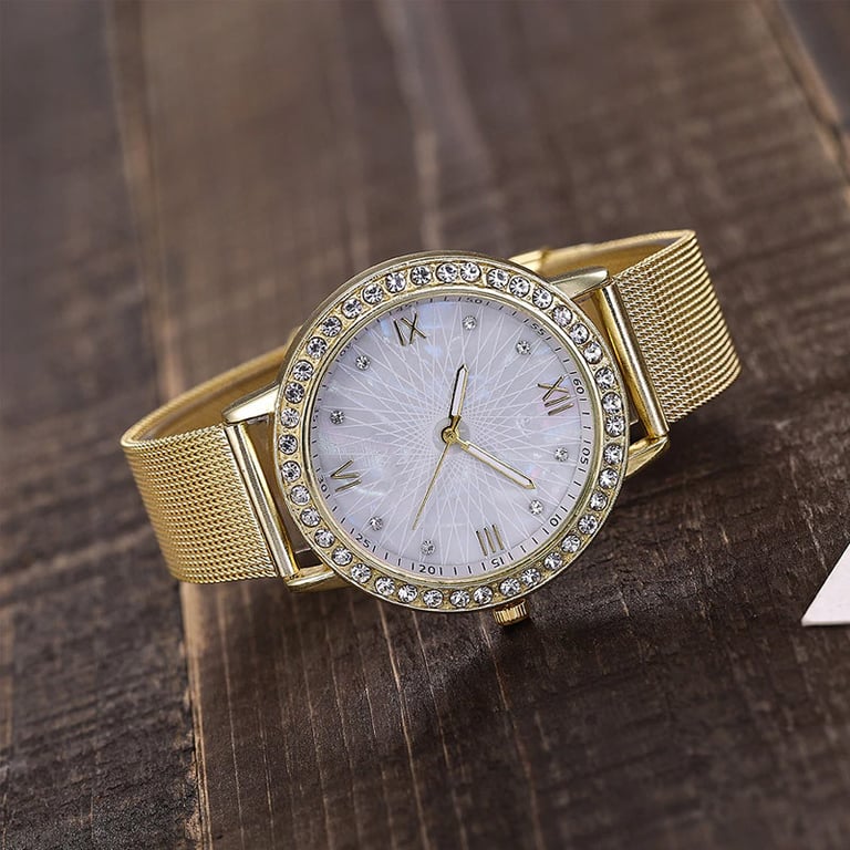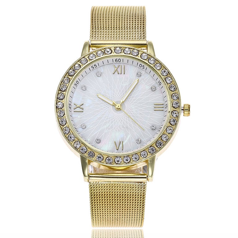Women's watch with a white dial adorned with white sparkling stones. The dial features Roman numerals. Adjustable strap. Available in three colour options.