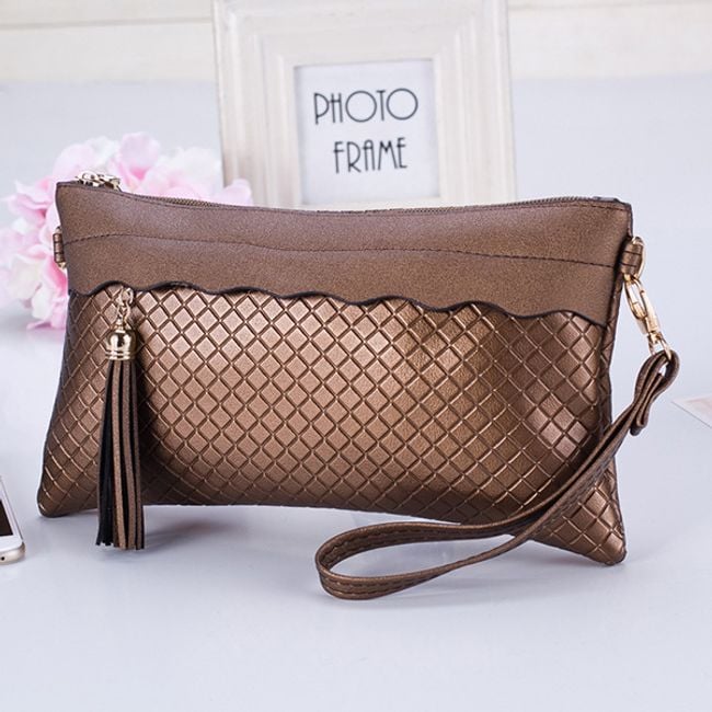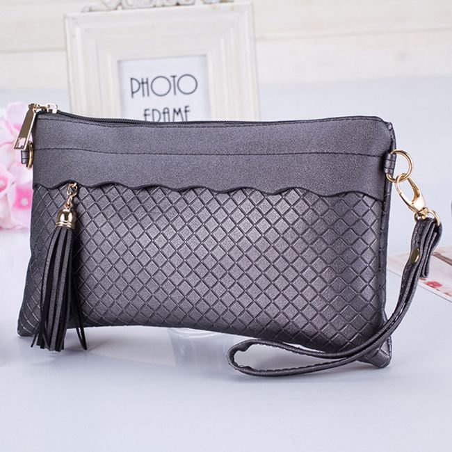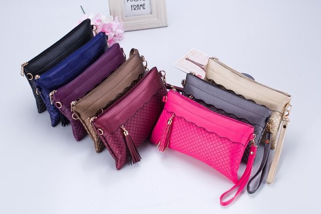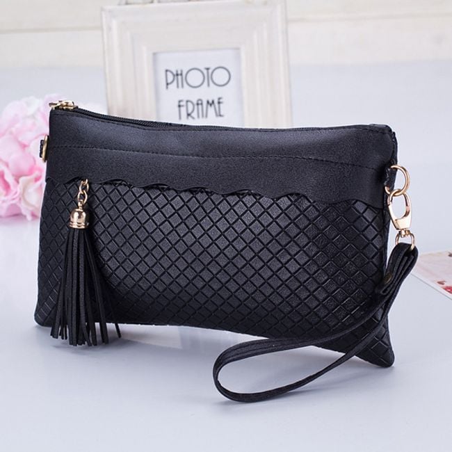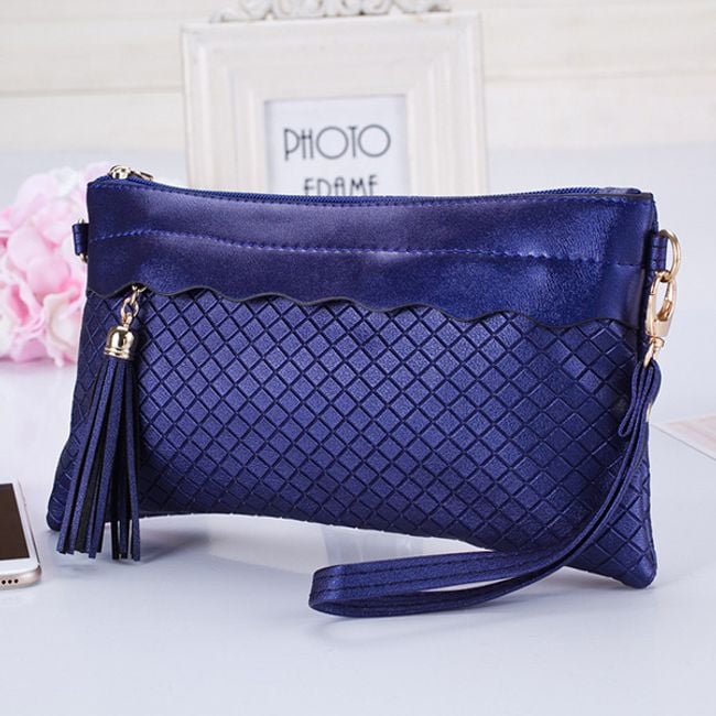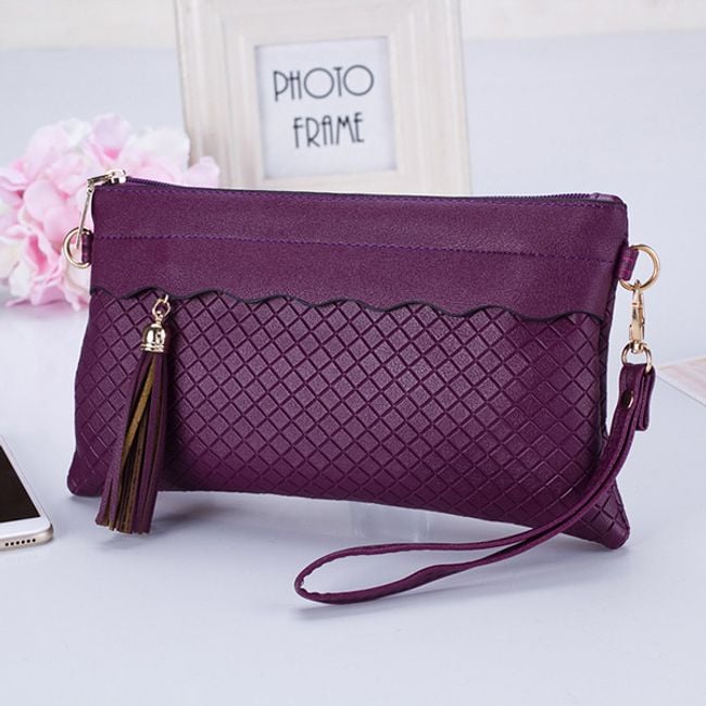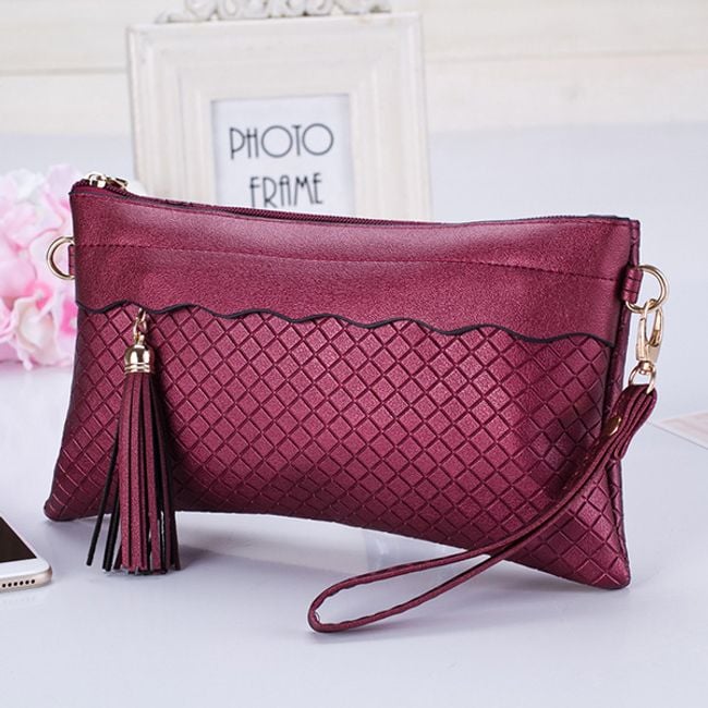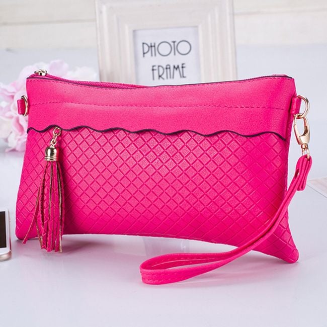 The clutch is adorned with a small tassel of the same colour. It comes with a crossbody strap and a wrist strap.