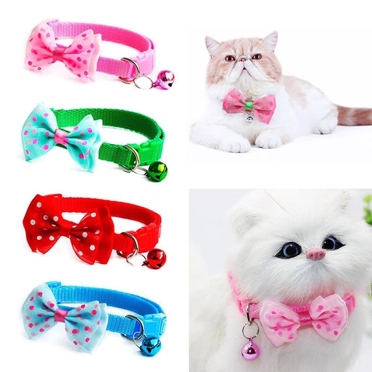 Nylon colour collar for cats. Adjustable fastening with a buckle. Large polka dot bow and a charm with a bell. Available in several variants.