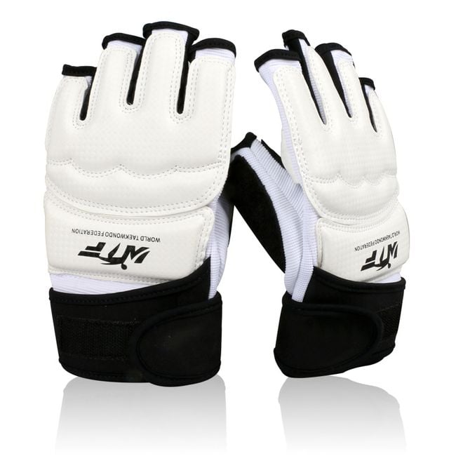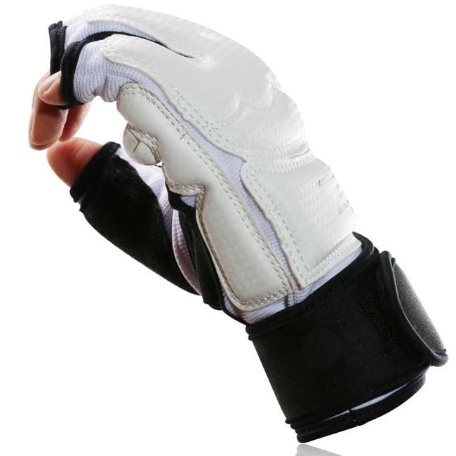 Boxing gloves for Taekwondo, MMA and other combat sports. The gloves are white and padded at critical points. They also feature a special ventilation area on the palm.