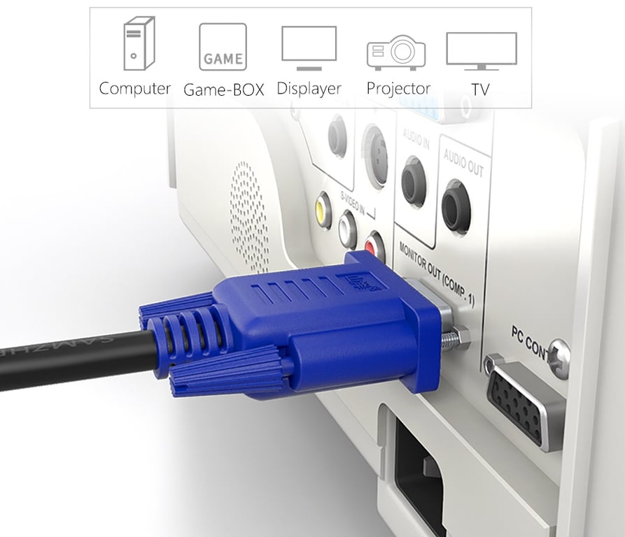 The VGA cable is used to connect a monitor to a computer, television, projector, etc.