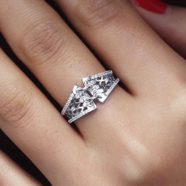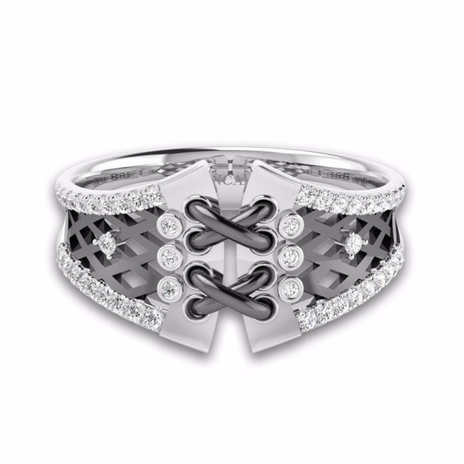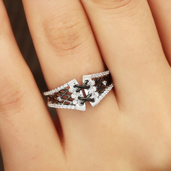 The ring looks like a corset, comes in silver or black, and is suitable as a stylish accessory for everyday wear.