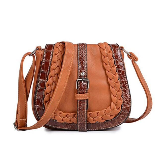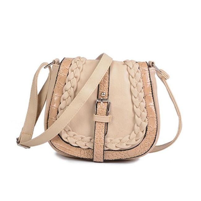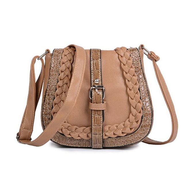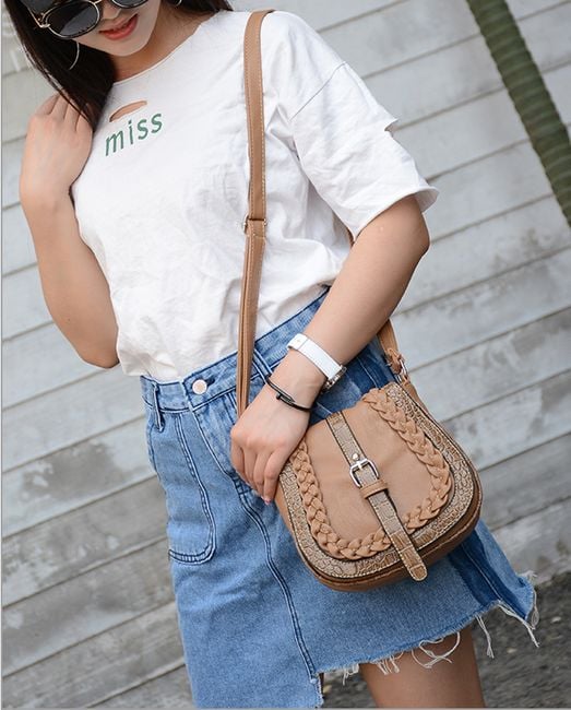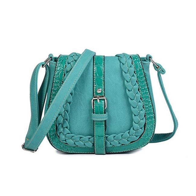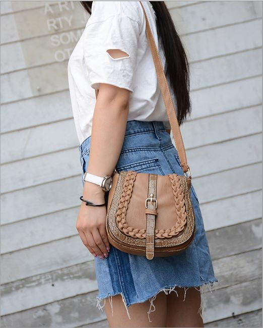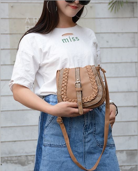 The small shoulder bag is adorned with a belt featuring a metal buckle.