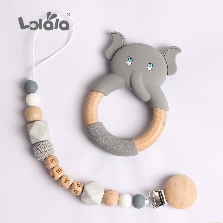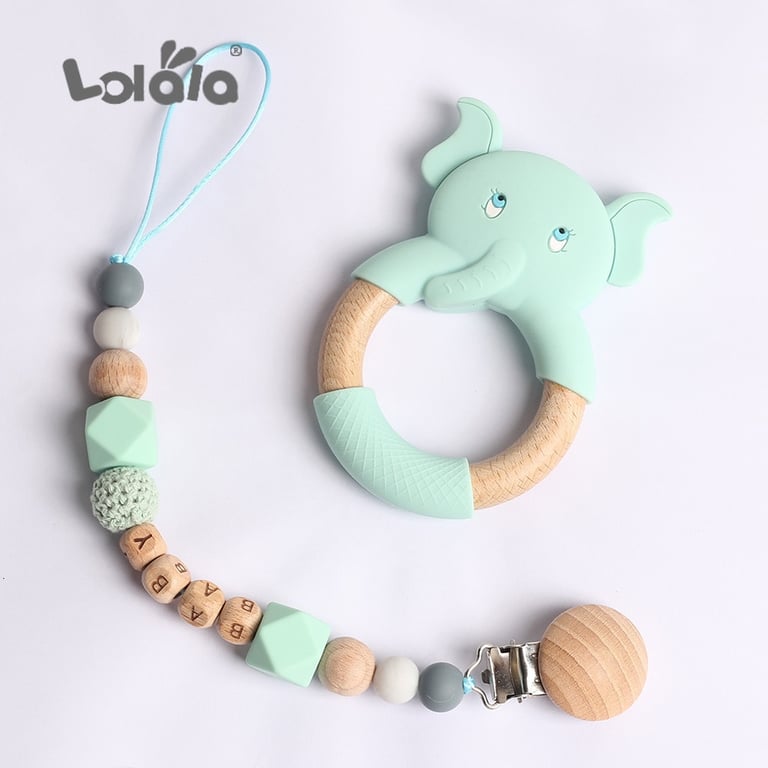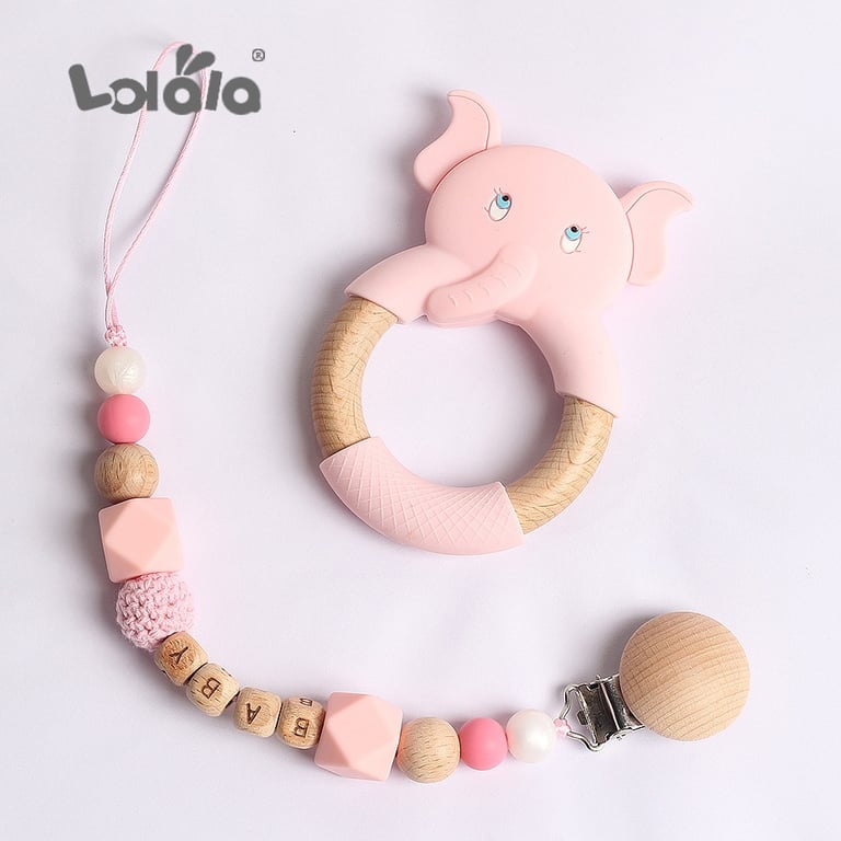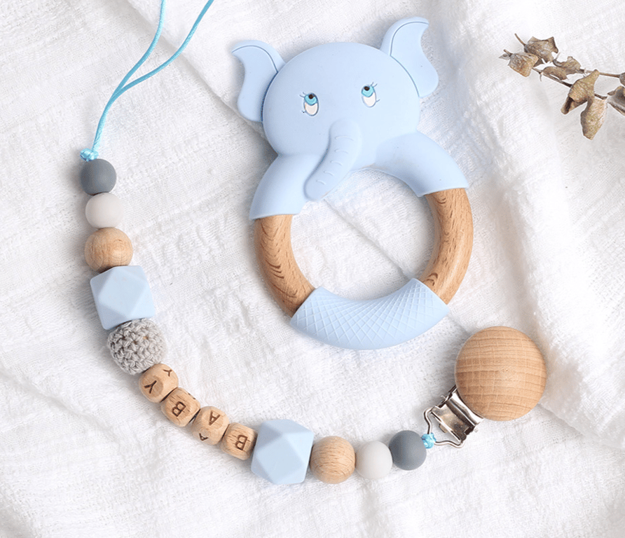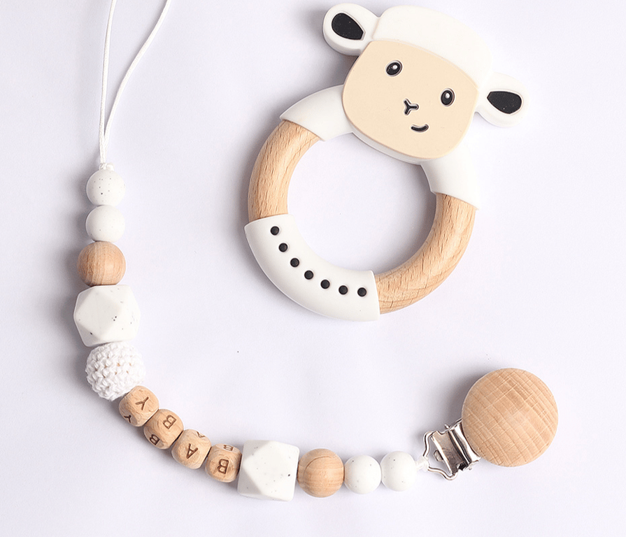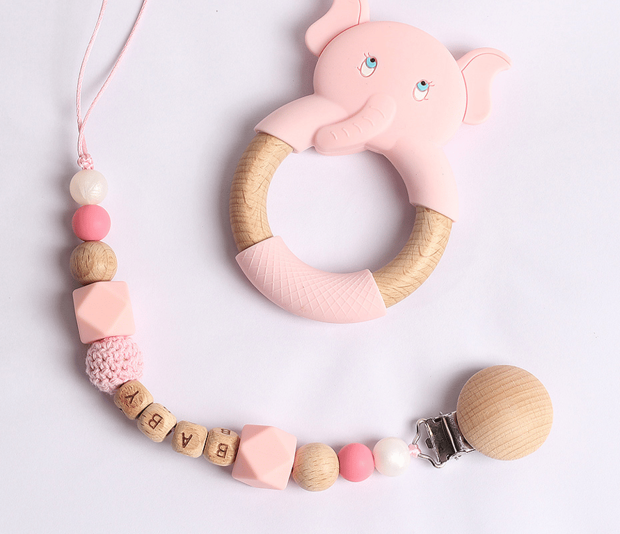 Pacifier clip in soft pastel colours with wooden details and cute little animals.