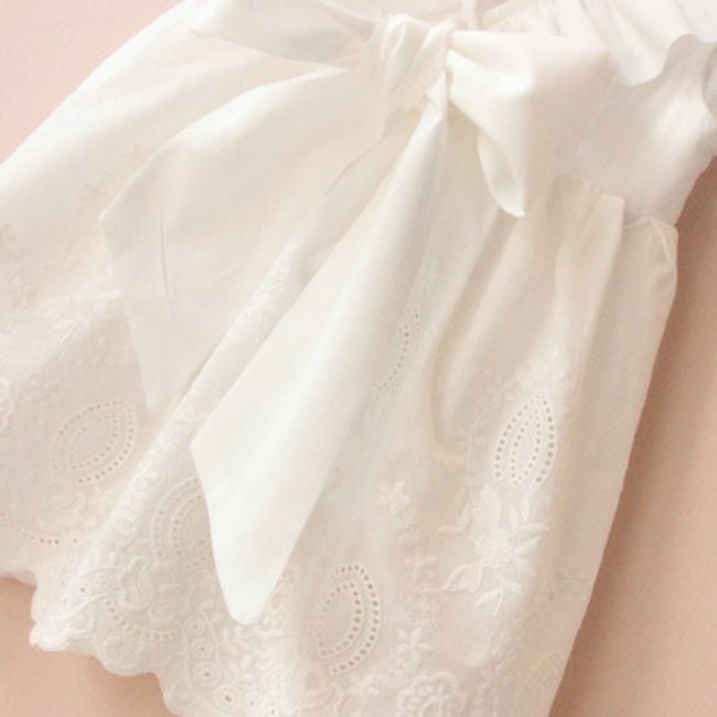 Beautiful little dresses for all the little fairies. This cute piece is perfect for hot summer weather. The dress is white and features a subtle ruffle, a bow on the back, and lovely lace details. Made from cotton material, it is breathable and airy. Available in six different sizes. You can find the size chart in the product description.
