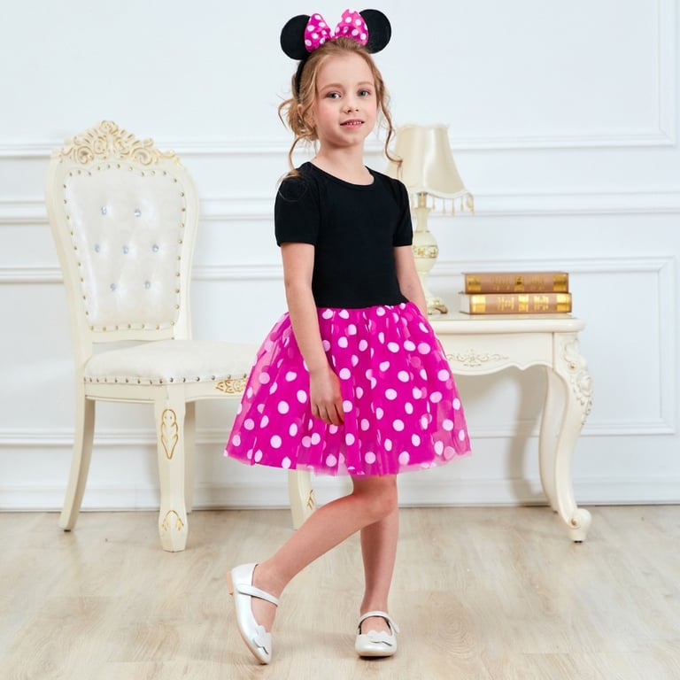 Solid colour top, polka dot skirt, headband with a polka dot bow and mouse ears.