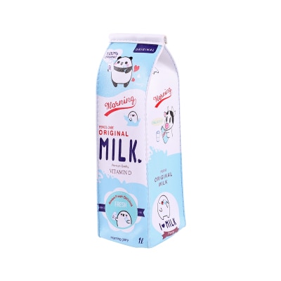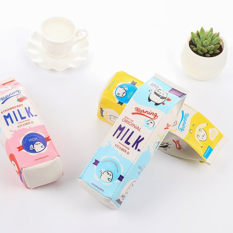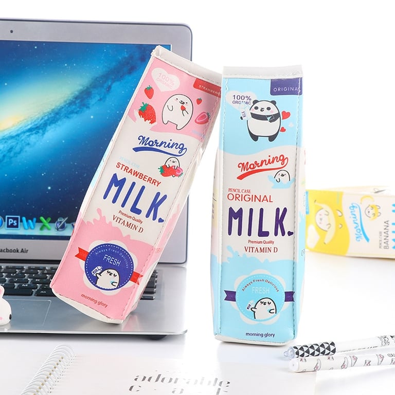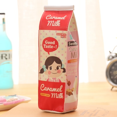 A funny and cute school pencil case in the shape of a milk carton.