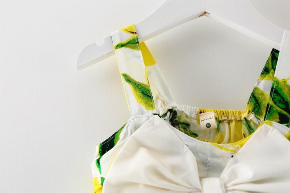 The dress features a colourful print and also has a decorative bow detail.