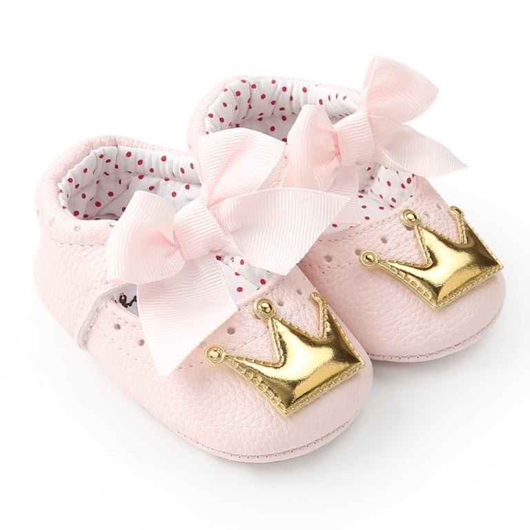 Toddler shoes decorated with a crown and bow are suitable for little girls.