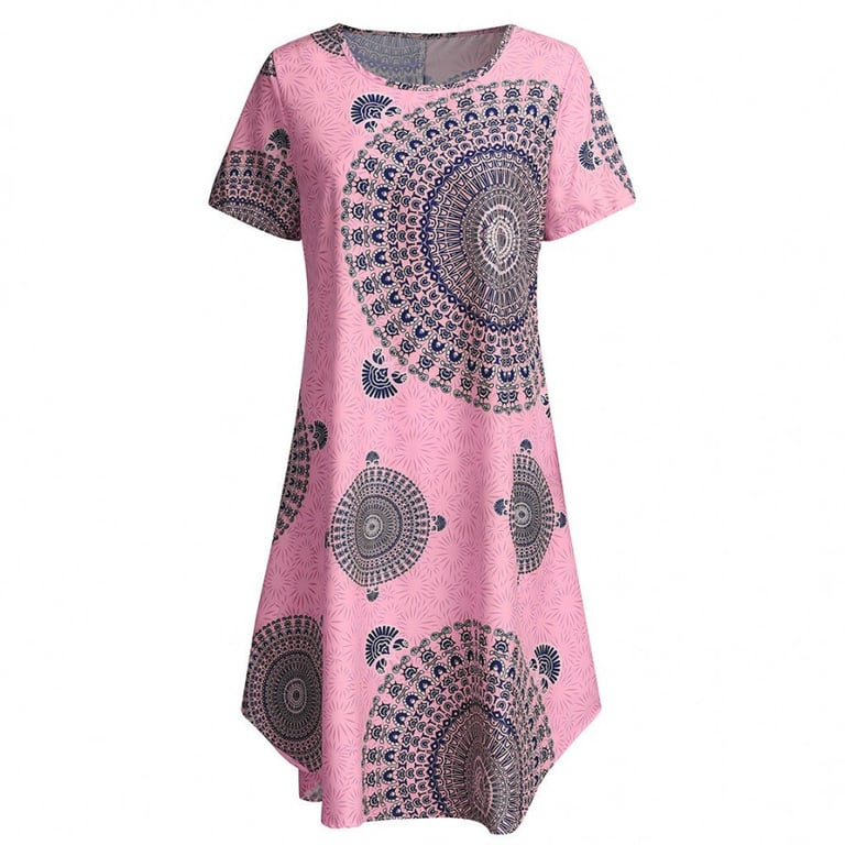 Women's loose-fitting dress with short sleeves and a round neckline. Printed with a colourful pattern. Available in multiple variants. Sizes up to 5XL.