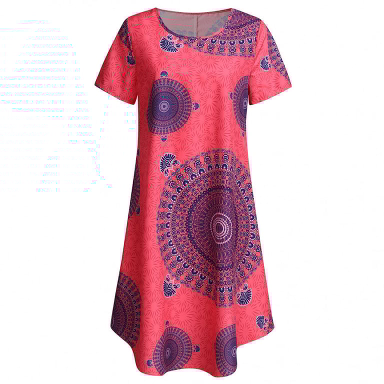 Women's loose-fitting dress with short sleeves and a round neckline. Printed with a colourful pattern. Available in multiple variants. Sizes up to 5XL.