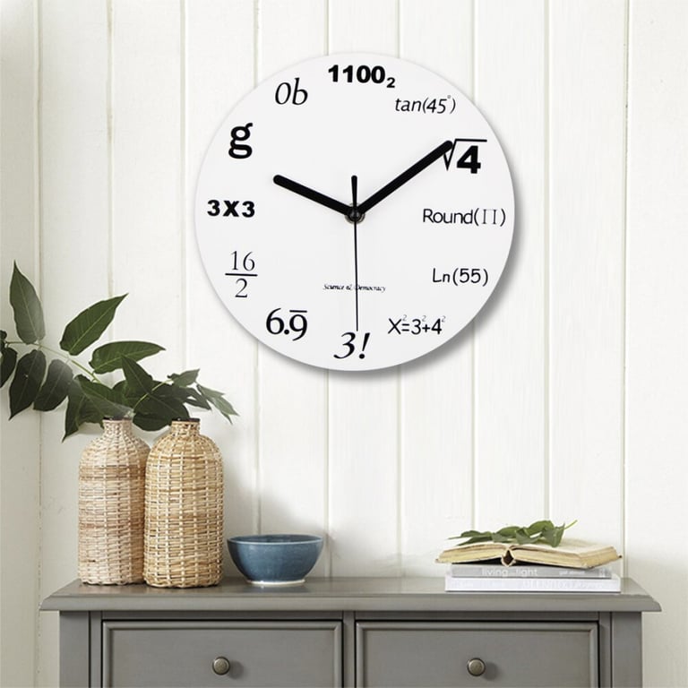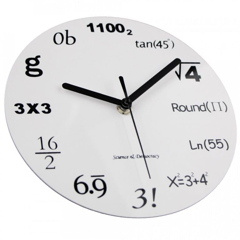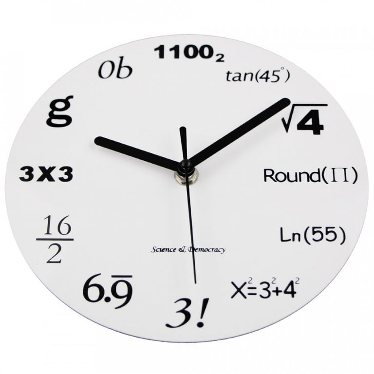 Round wall clock in white design with mathematical formulas instead of numbering.