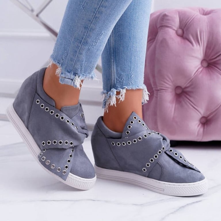 Women's slip-on shoes with a decorative bow and studs. The shoes have a round toe and a flat rubber sole with a platform. Available in multiple colour options.